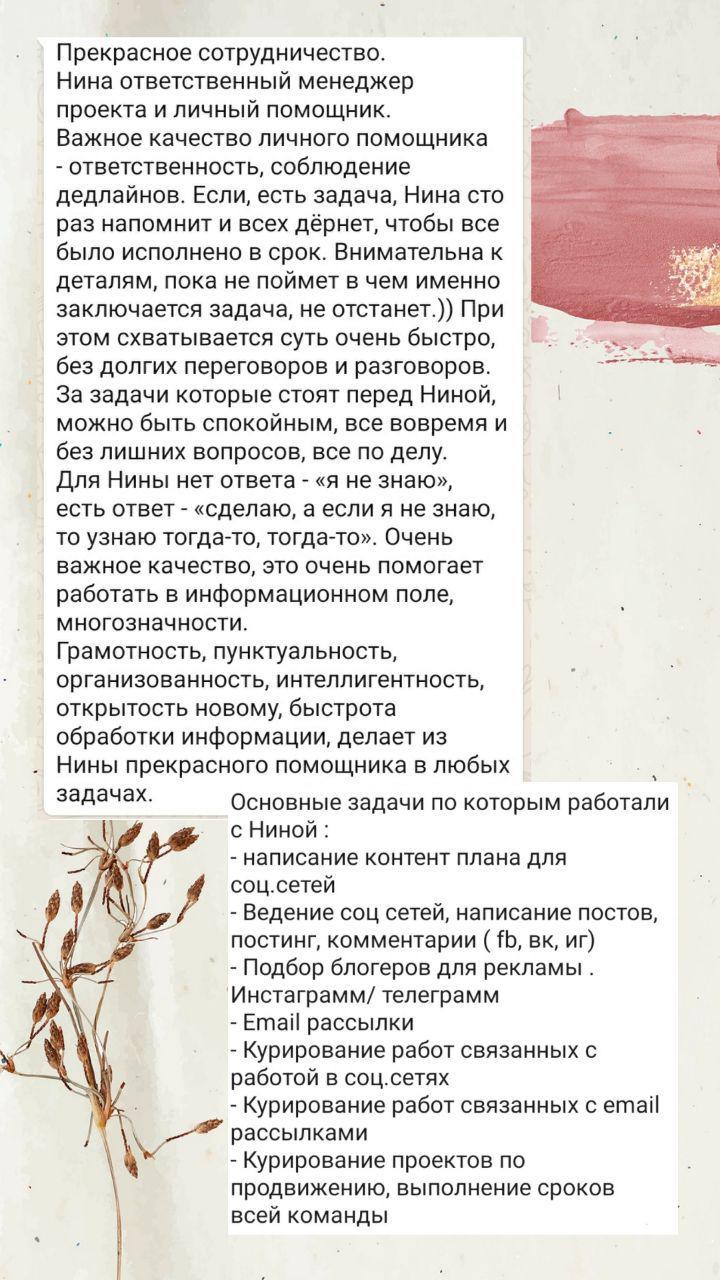 Организованный и комплексный подход к работе помогает мне сделать ваш бизнес более эффективным. Помогу осуществить план по обучению команды или фотосессию в любой стране мира, организовать и проконтролировать любые рабочие процессы. Обязанности могут быть разнообразными, условие лишь одно - я работаю полностью удаленно!